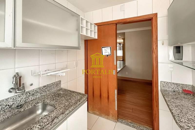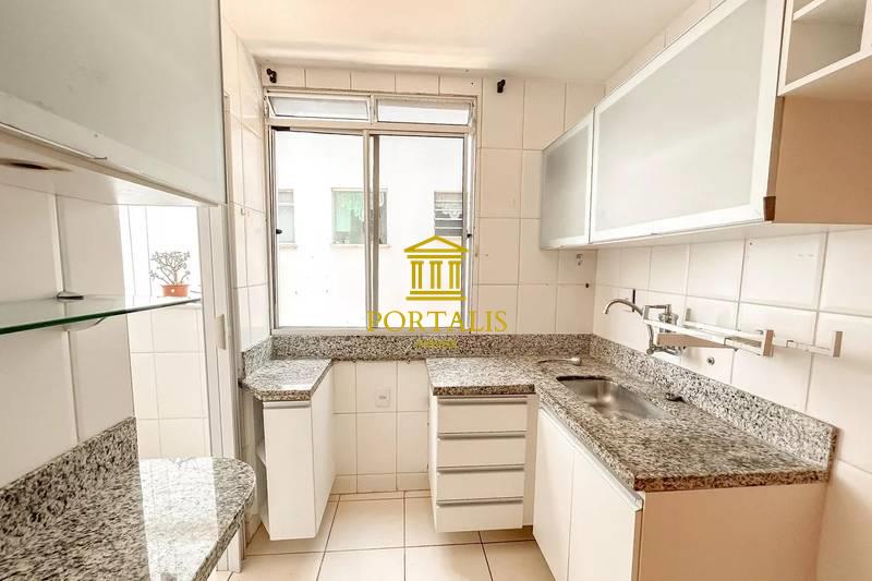 Cozinha funcional com armários planejados, piso em cerâmica e bancada em granito.