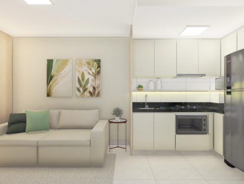Com aproximadamente 40 m², o studio apresenta planta inteligente e bem distribuída, composta por: